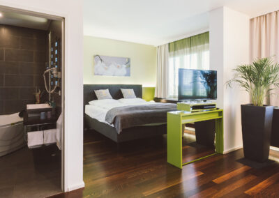 Komfortabel modern eingerichtete Zimmer mit Annehmlichkeiten wie Whirlpoolbadewanne mit eigenem TV-Gerät nebst dem großen Flatscreen im Zimmer verstömen jenen Hauch von Luxus, den man sich gerne von Zeit zu Zeit schenkt.
