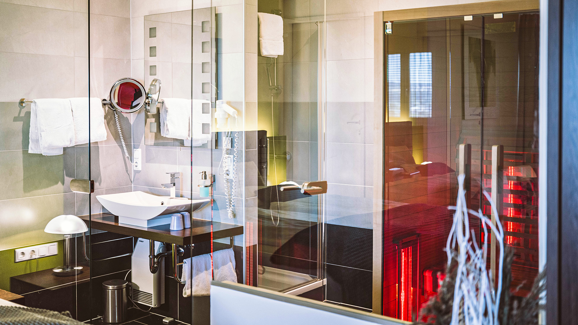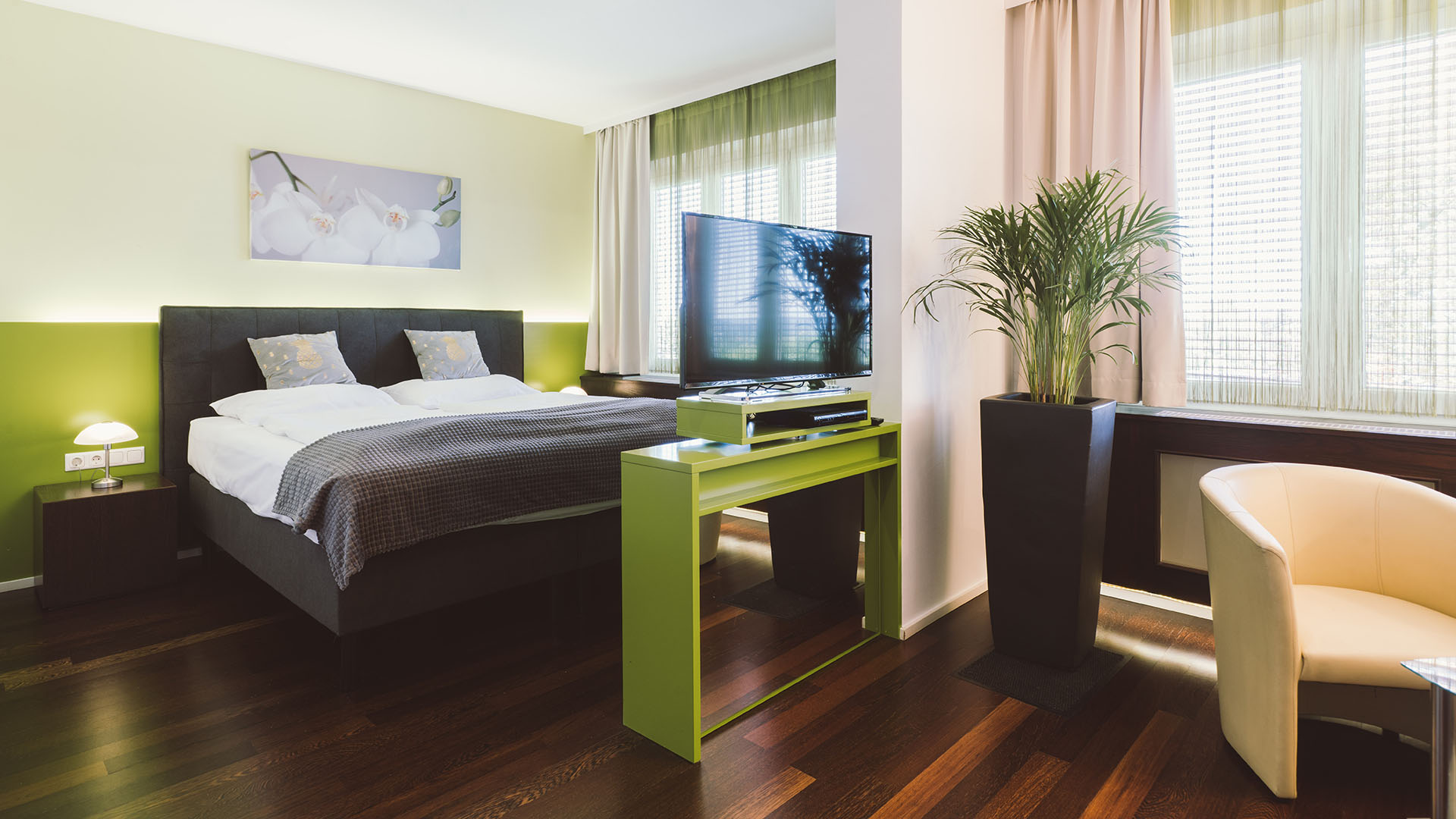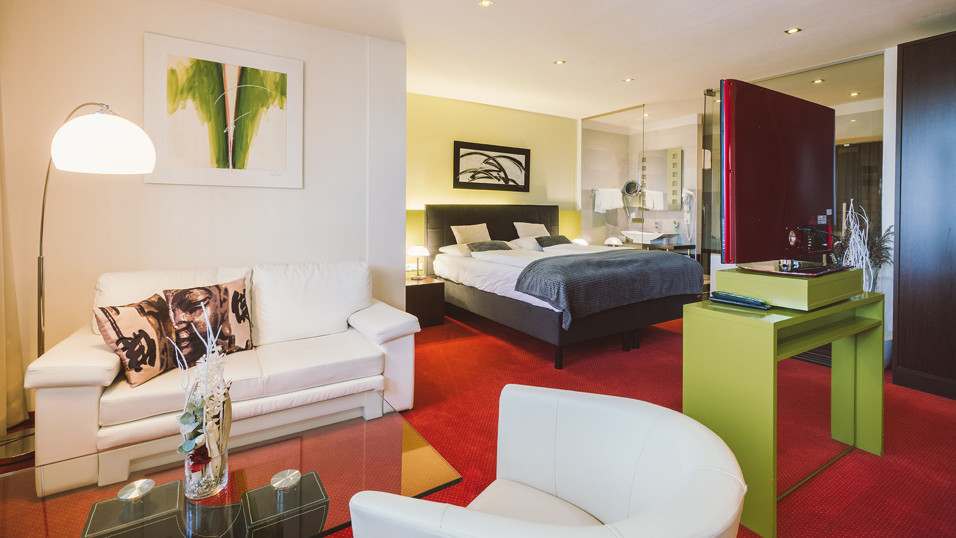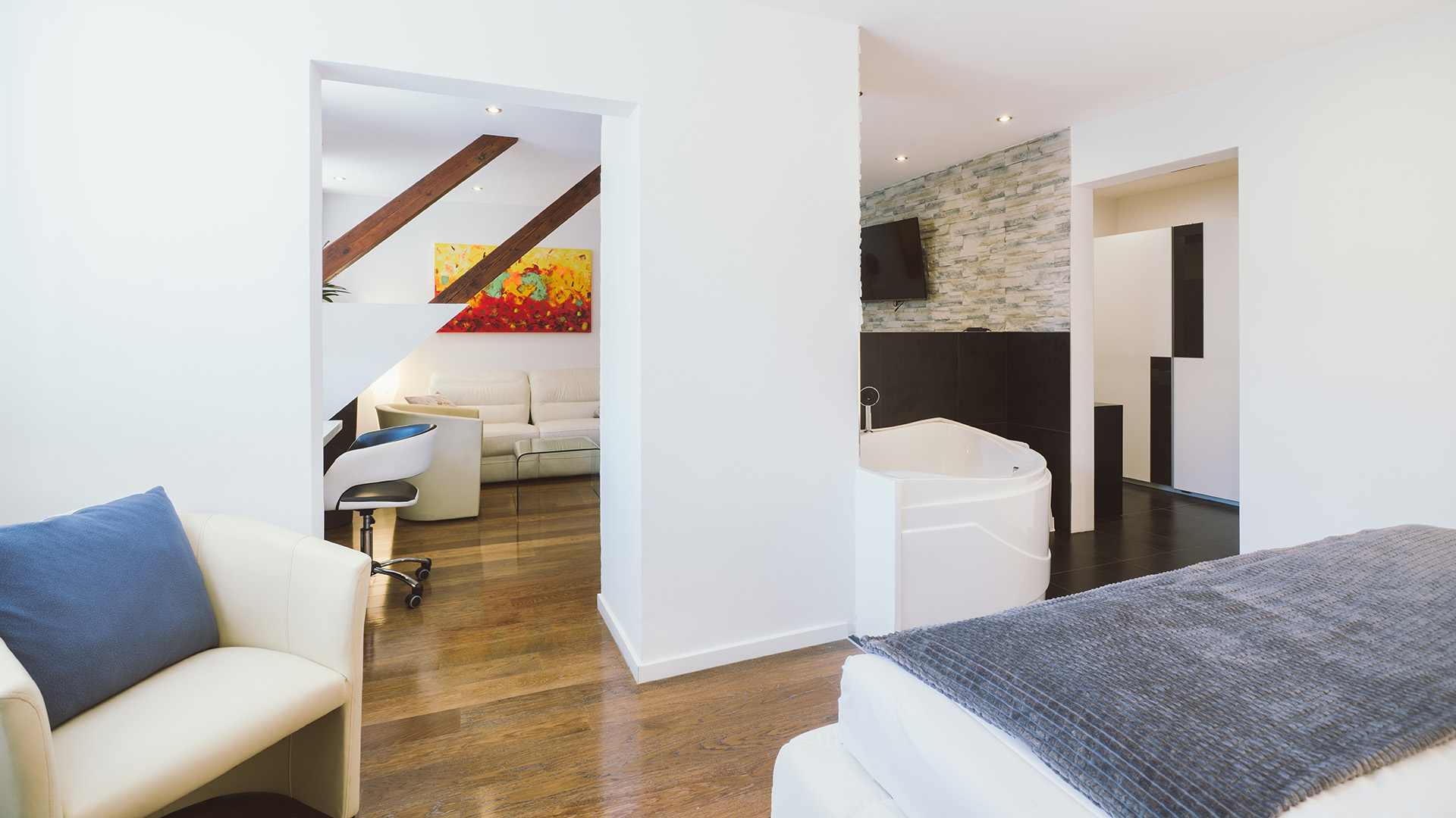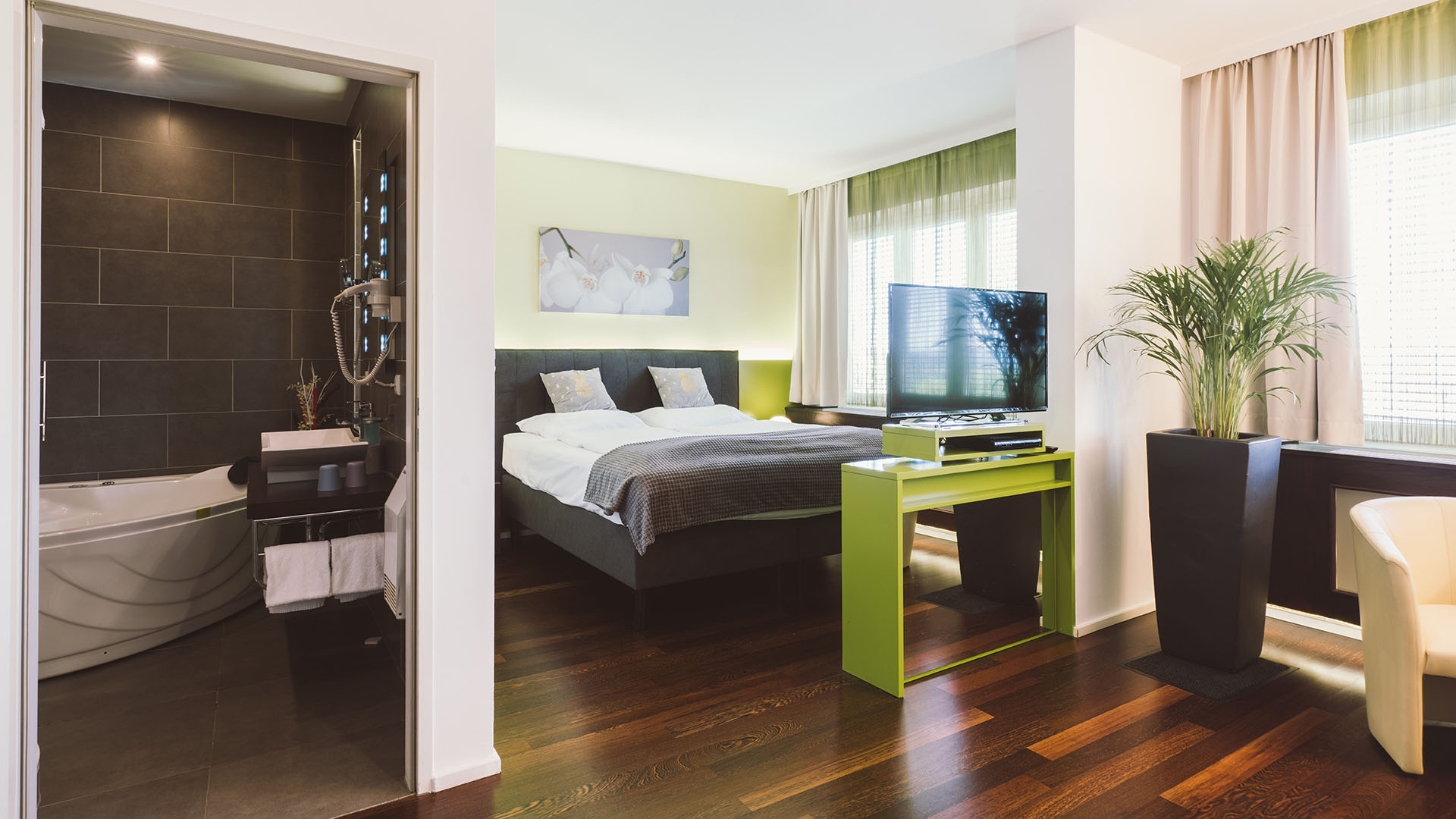 Komfortabel modern eingerichtete Zimmer mit Annehmlichkeiten wie Whirlpoolbadewanne mit eigenem TV-Gerät nebst dem großen Flatscreen im Zimmer verstömen jenen Hauch von Luxus, den man sich gerne von Zeit zu Zeit schenkt.